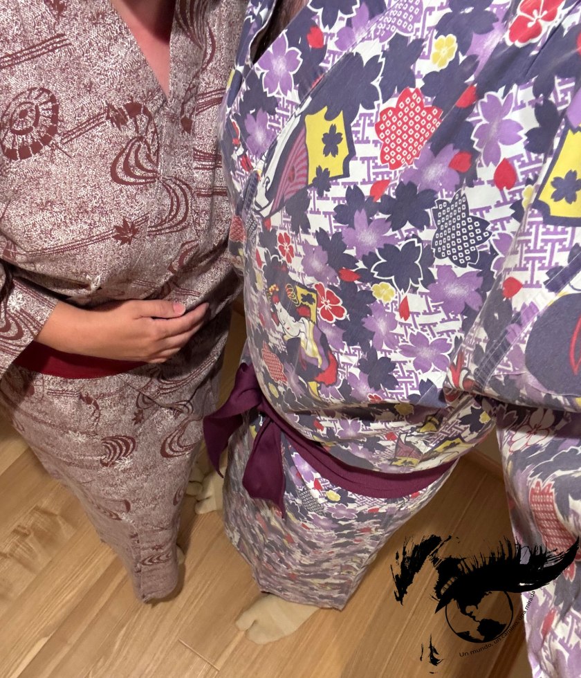 Para movernos por sus instalaciones, en ambos, nos facilitaron zapatillas y una especie de pijamas de dos partes. Previo a la llegada, nos contactaron para preguntarnos la talla por lo que los teníamos preparados en la habitación. Los yukatas solamente se usan para el baño, dícese para desplazarse de la habitación a los baños compartidos o a los baños privados reservados. En ninguno de los dos ryokans en los que fuimos se permitía acceder al comedor para la cena o desayuno en yukata. De hecho, éstos ni siquiera estaban disponibles en la habitación. En un ryokan se debían pedir en recepción y en el otro había un cuarto con yukatas de diferentes tallas y colores y donde cada uno podía escoger el que quisiera.
