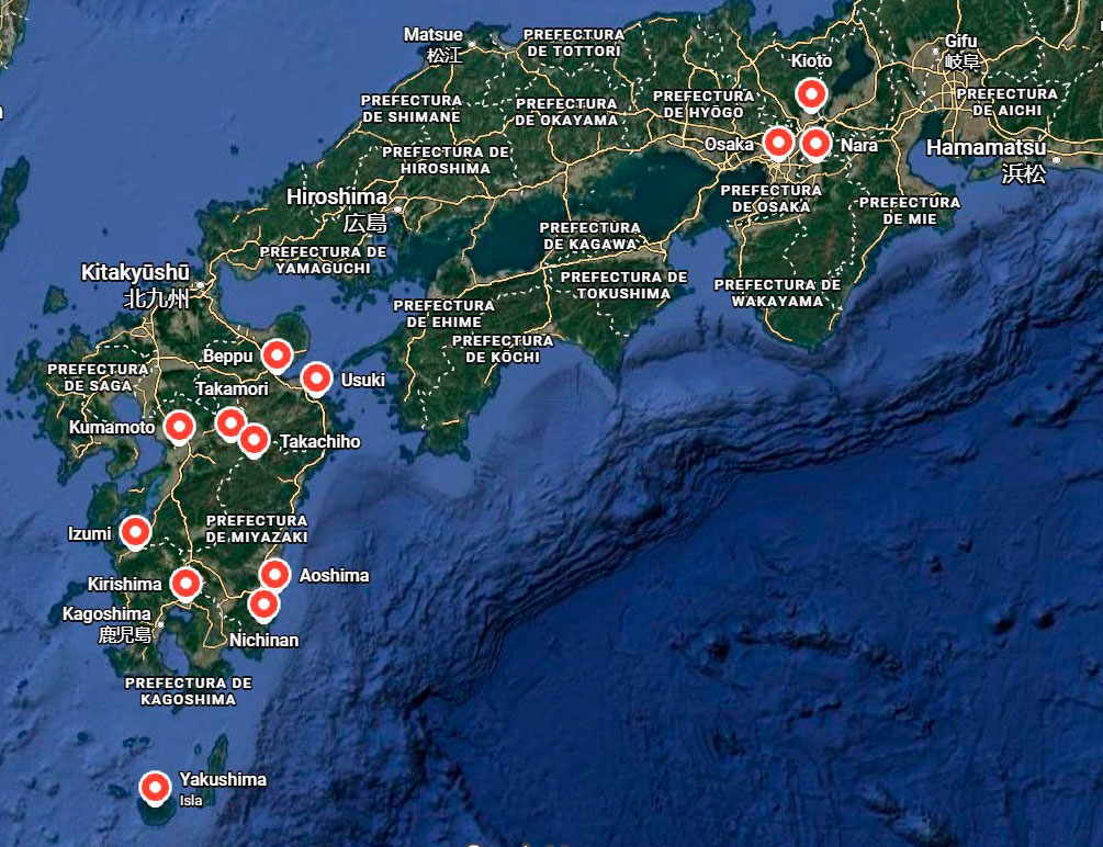 El mes de enero de este año es muy especial para nosotros, pues además del cumpleaños de Xavi, también celebramos nuestro aniversario, y es que solo una vez se celebran 20 años juntos. Y dado que será un viaje de celebración, decidimos volver a Japón para seguir con nuestro trayecto que empezamos en junio del año pasado cuando visitamos la ciudad de Tokio y la región de Tohoku. A este viaje le dedicaremos el mismo número de días que al viaje anterior (un total de 24 días), pero esta vez centrándonos en el triángulo Kioto-Nara-Osaka y en dos islas del sur: Kyushu y Yakushima. Kyushu es la tercera isla del archipiélago (tras Honshu y Hokkaido) en cuanto a tamaño y es considerada la cuna de la civilización japonesa. Aquí nos daremos un baño en las arenas volcánicas de Beppu, veremos las grullas en Izumi y presenciaremos una representación de Kagura en Takachiho. Por otro lado, Yakushima es una pequeña isla situada al sur de Kyushu y fue el primer lugar en ser declarado Patrimonio de la Humanidad de Japón. Además, es el hogar de ciervos y macacos endémicos, y sus bosques de cedros milenarios inspiraron a Hayao Miyazaki para ambientar la película de animación La Princesa Mononoke.