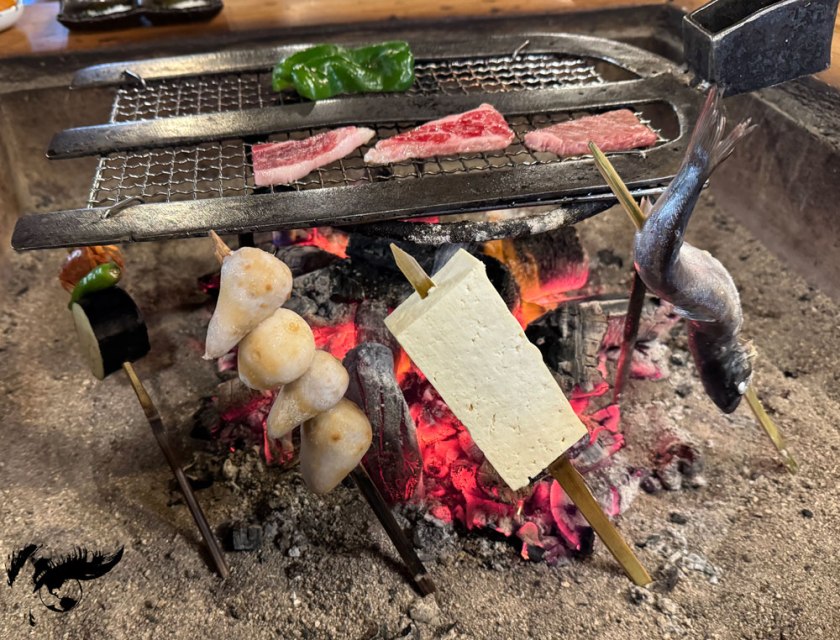 Takamori dengaku no es solamente el plato típico de Takamori sino también toda una experiencia. Se trata de vegetales, taro, tofu y pescado de río asados a la brasa, aderezados con miso de yuzu y acompañados de sopa de miso, arroz y encurtidos. Cada mesa tiene su propia brasa en la cual se van cocinando los alimentos poco a poco. A nosotros nos aceptaron sin reserva, sin embargo, se recomienda reservar con antelación para evitar no poder ser atendidos.