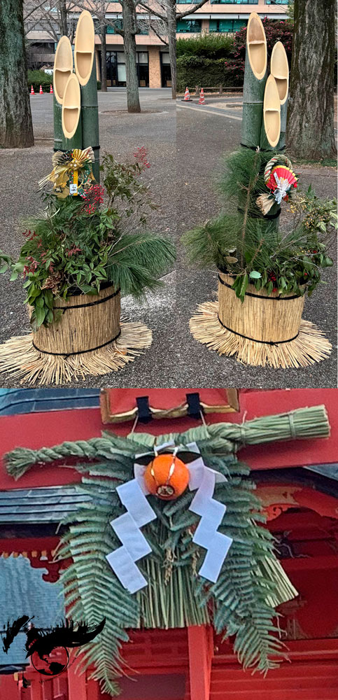 La celebración de Año Nuevo en Japón no tiene nada que ver con lo que se vive en España o en Europa. El año no se despide con fiestas ni fuegos artificiales, sino con una serie de ceremonias y rituales cargados de simbolismo. Un ejemplo de estos símbolos son los adornos kadomatsu (pino y bambú) y shimekazari (cuerdas de arroz) o las ofrendas kagamimochi (mochi redondos). Kadomatsu es un adorno formado por tres elementos: cañas de bambú, ramas de pino y ramas de ciruelo que representan la fortaleza, la longevidad y la prosperidad. Van en pares, colocados a la entrada para dar la bienvenida a los dioses (kami). Estos se colocan entre el 26 y el 28 de diciembre y se retiran el 7 de enero. De manera similar, shimekazari es un adorno que cuelga sobre la puerta de la entrada y cuya finalidad es proteger contra la mala suerte y preparar el hogar para recibir al dios del año nuevo, Toshigami. Este adorno está hecho de cuerda de paja de arroz (shimenawa), origami y cítricos. Por otro lado, kagamimochi consta de dos pasteles de arroz apilados uno encima de otro coronados con una naranja daidai y que es una ofrenda común en estas fechas en los santuarios. También es costumbre tener un kagamimochi (símbolo de la continuidad familiar y la buena fortuna) en el altar sintoísta dentro de casa. El día 11 de enero se celebra kagami biraki o la ceremonia de romper el mochi. Estos mochis no se pueden cortar con el cuchillo (mal augurio) sino que se rompen con las manos o con un pequeño mazo y los trozos se cocinan en sopa (ozoni).