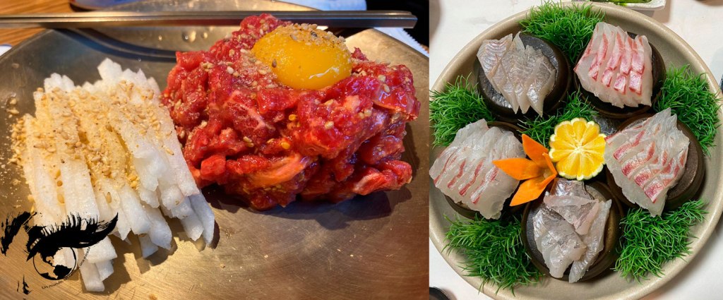 Yamagata, capital de la prefectura homónima, es famosa por su ternera, llamada Yonezawa-gyu. Se trata de una carne (wagyu) de alta calidad, caracterizada por un sabor delicado y una textura que se deshace en boca. Es común probar esta carne en preparaciones como shabu-shabu (donde se sumerge en un caldo caliente parecido al hot-pot chino), sukiyaki (guiso) o yakiniku (barbacoa similar a la barbacoa coreana). Dado que queríamos notar el sabor de la carne, elegimos probarla en yakiniku. Además de los diferentes tipos de corte, nos sirvieron setas y cebolla, dos salsas, kimchi y hojas de lechuga. Similar a la barbacoa coreana, cada cual se asa su propia carne y verduras sobre una placa caliente situada en el centro de la mesa. La carne, una vez en su punto, se moja en las salsas y se enrolla en las hojas de lechuga para comer.