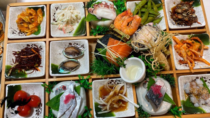 Por otro lado, los restaurantes que sirven pescado y marisco crudos son bastante fáciles de identificar, ya que normalmente disponen de grandes peceras donde guardan los peces y el marisco vivos hasta la hora de servirlos. La ciudad de Seogwipo en Jeju fue nuestra elegida para degustar este manjar y la verdad que no nos arrepentimos. Nos sirvieron una gran bandeja que contenía desde el famoso pulpo crudo que aún retuerce sus tentáculos a pesar de estar cortado, oreja de mar totalmente viva (aún se movía), diferentes tipos de pescado crudo, hasta mini cangrejos marinados que se comen enteros. El pulpo crudo es el que nos dio un poco más de apuro porque nos preocupaba no masticarlo suficiente, ya que habíamos leído que con las ventosas se puede quedar enganchado a la garganta. La verdad es que, tras probarlo, tampoco diríamos que fuera nuestro favorito (¡donde está el pulpo a la gallega que se quite lo demás!), pero como experiencia no ha estado nada mal. Para limpiar el paladar entre plato y plato, los coreanos mastican raíz de jengibre mojada en miel, y así lo hicimos nosotros también.