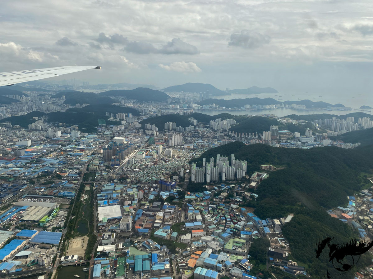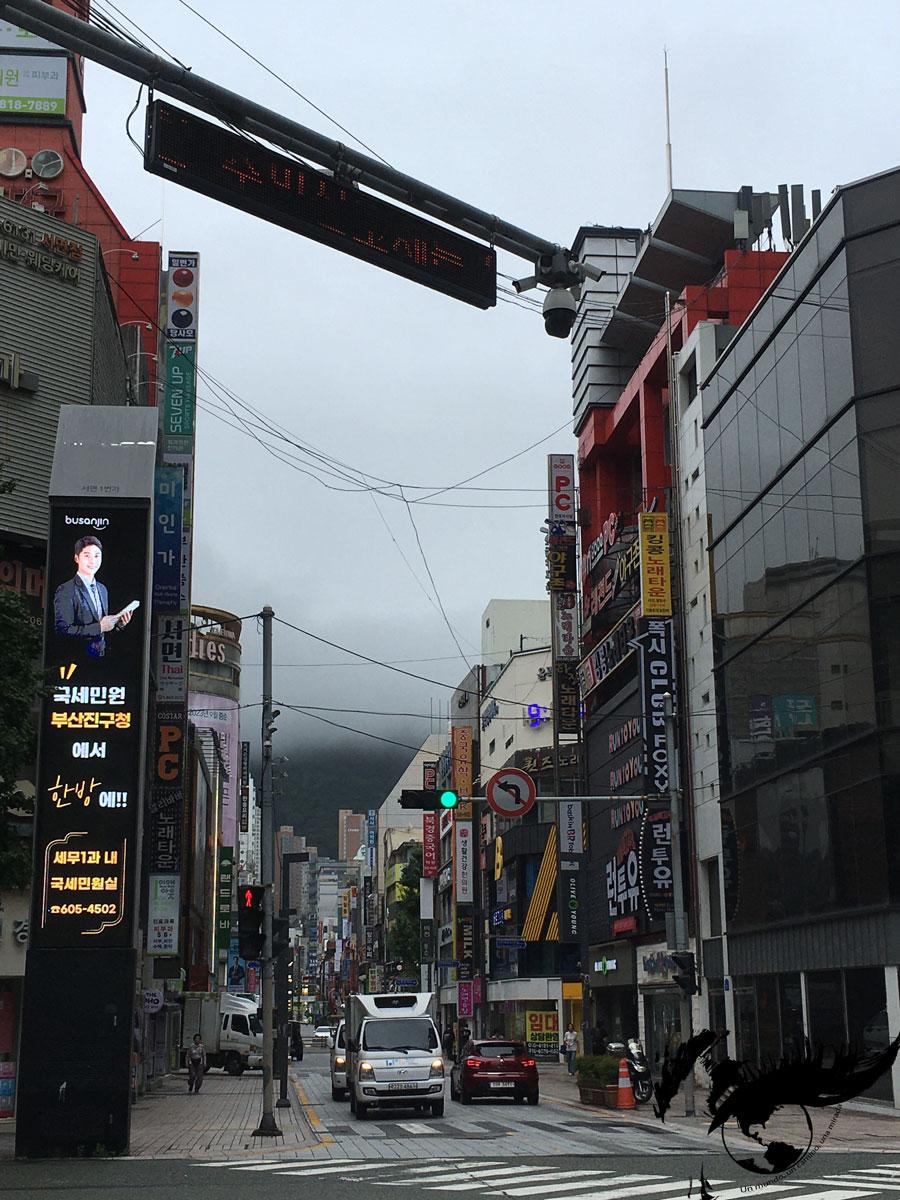 Llegamos a Busán con un día despejado, y tras dejar las maletas en el hotel, fuimos directos a comer y a planificar la tarde, ya que el hecho de llegar más tarde de lo que teníamos previsto nos hizo tener que retocar el itinerario con el que veníamos en mente. Nuestro plan inicial era hacer el trekking del Igidae Coastal Walk, pero dado que por la tarde-noche teníamos una actividad reservada desde Barcelona, no lo acabamos de ver factible… Y por si no se podía torcer más el día, mientras comíamos nos volvieron a llegar los avisos de seguridad por tormenta. Y dicho y hecho, antes de poder poner rumbo a ningún lado, ya empezó a llover… Este día empezamos a sospechar que nos habían asignado una nube de oficio al tramitar el visado y que esta nube nos iba a acompañar durante todo el viaje…