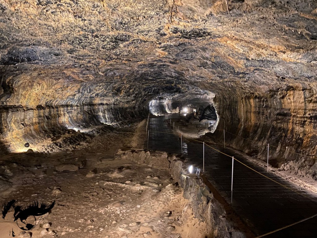 Un calor abrasador nos dio la bienvenida, así que nos lo tomamos con calma y lo primero que hicimos fue buscar un sitio para comer y de paso planificar la tarde. Y nuestra primera visita fue el túnel de lava Manjaggul, una de las principales razones por las que decidimos visitar la isla. Esta cueva tiene una longitud total de 13.422 m, por lo que es considerada como la más grande del mundo, y es declarada Patrimonio Natural de la Humanidad. Durante las erupciones volcánicas la lava fluye hacía el mar y, durante su recorrido, la lava de la superficie se va enfriando y solidificando, dando lugar a túneles, como este. Existen tres entradas a la cueva, pero solamente una está abierta al público. Se puede recorrer 1 km en su interior y se pueden observar una gran variedad de estructuras formadas a partir de lava. Dentro de la cueva, la temperatura oscila entre los 11º y los 22º, por lo que es recomendable llevar alguna prenda de manga larga, aunque con el calor del exterior no apetezca mucho. También es recomendable llevar un buen zapato, ya que el suelo suele ser bastante resbaladizo.