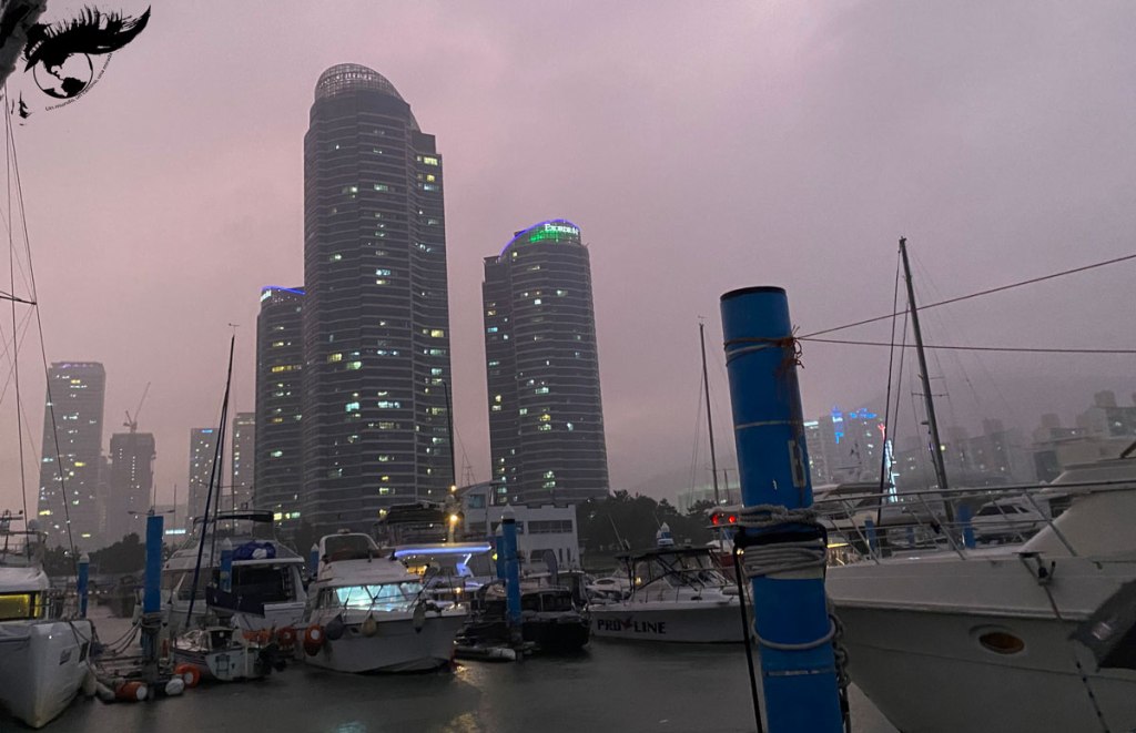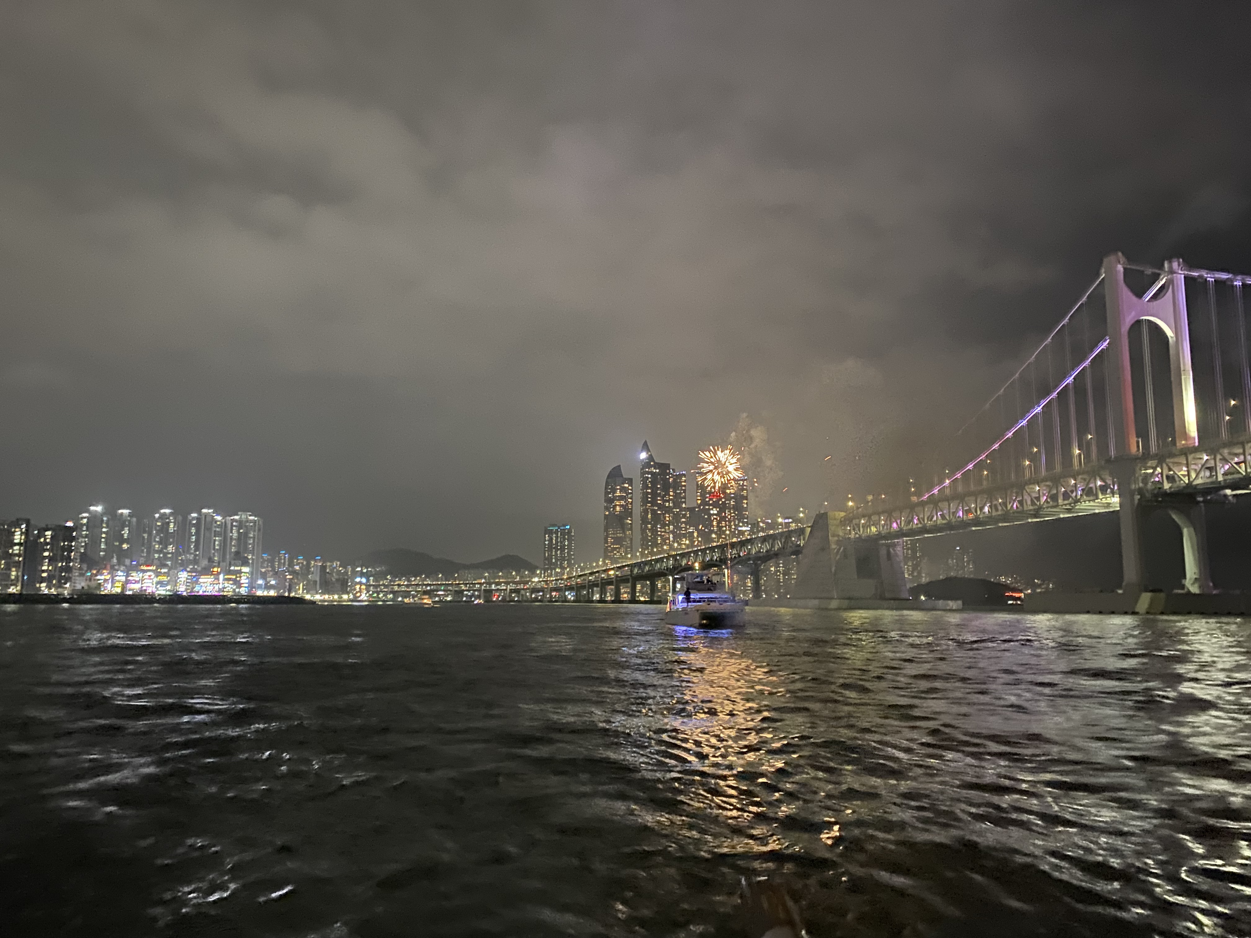 A pesar de llover a mares, teníamos una actividad reservada que no podíamos cancelar, aunque nos empezó a preocupar, y es que se trataba ni más ni menos que de subir a un barco para ver las vistas de la ciudad desde el mar… Y allí que fuimos al muelle pensando que, a lo mejor, se cancelaría debido a la fuerte lluvia, pero para nuestra sorpresa no fue así. No solo que nuestro barco zarpó, si no que también lo hicieron algunos otros barcos, así que solamente quedaba rezar a que el dios de mar no quisiera quedarse con nosotros jajajaja. En el barco embarcamos nosotros, otra pareja coreana y una familia de tres, coreanos también. El capitán nos dio unos chubasqueros de plástico y un chaleco salvavidas y ¡a la mar! Pero tuvimos suerte y la lluvia fue amainando a medida que avanzábamos y pudimos disfrutar de unas vistas preciosas. Además, los barcos que ofrecen estos trayectos lanzan fuegos artificiales para mejorar así, si cabe, las vistas de la ciudad.