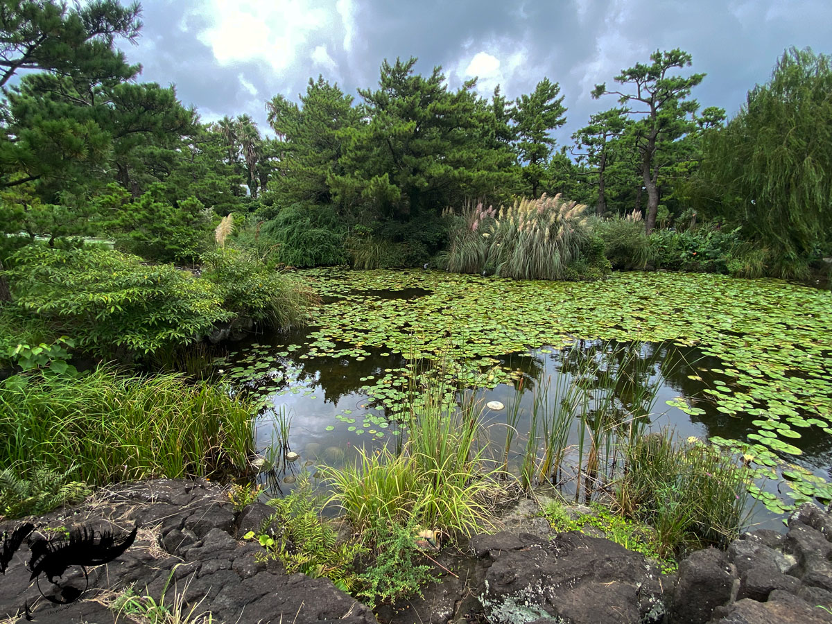 La decisión final fue visitar el parque Hallim, pensando que sería más fácil de visitar con lluvia, aunque nuestra mayor sorpresa fue que, nada más llegar al parque, la lluvia decidió darle paso a un sol radiante. Volviendo al parque, éste fue creado en 1971 y cuenta con multitud de plantas y de árboles bellamente dispuestos, dos túneles de lava, un jardín botánico de plantas tropicales, un jardín de bonsáis, y una aldea folclórica Jaeam. Las cuevas, Ssangyong y Hyeopjae, se formaron hace 250 mil años por la erosión volcánica. Una particularidad de estas cuevas es el hecho que, por la penetración del agua con cal, fueron adquiriendo un color dorado. Aunque solo se pueden visitar estas dos cuevas, éstas están interconectadas con hasta 20 otras cuevas que constituyen un solo sistema con una longitud de 17.000 m. Actualmente son Patrimonio Nacional Natural y se consideran únicas en el mundo.