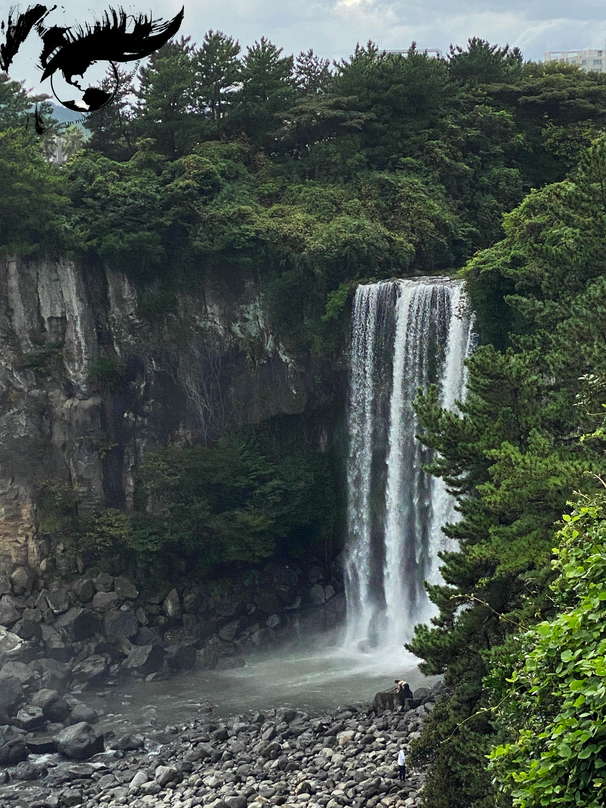 Nuestro tercer y último día en la isla volvió a amanecer lluvioso… Sin embargo, este día decidimos desplazarnos hasta la ciudad de Saeogwipo para visitar la roca Oedolgae, la cascada Jeongbang y la cascada Cheonjiyeon. Los tres destinos de encuentran a poca distancia entre sí. Nuestra primera parada fue la cascada Cheonjiyeon. Esta cascada tiene una altura de unos 22 m y un ancho de 12 m y fue designada como Tesoro Natural, tanto por ser el hábitat de las anguilas mutaejangeo como por el bosque que la rodea.