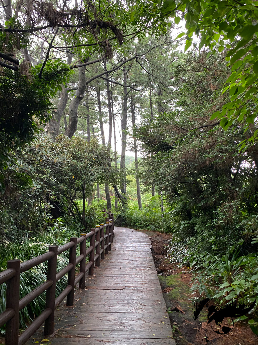 Y, efectivamente, tras una noche de tormenta, nuestro segundo día en Jeju comenzó pasado por agua. Aún así, decidimos ir al bosque Bijarim, el mayor bosque de árboles bija (Torreya nucifera) de Corea, en el que se encuentran más de 2.800 árboles de entre 500 y 800 años, siendo el mayor atractivo un ejemplar de bija con más de 820 años. El trayecto es circular y es muy fácil de recorrer. Para nuestra suerte, fue llegar al parquing y dejó de llover, así que pudimos disfrutar del trayecto en condiciones. Aun así, por la lluvia había algunos tramos embarrados, pero en Corea están en todo y a la salida del parque hay unas fuentes preparadas para limpiarse los zapatos antes de subir al coche.