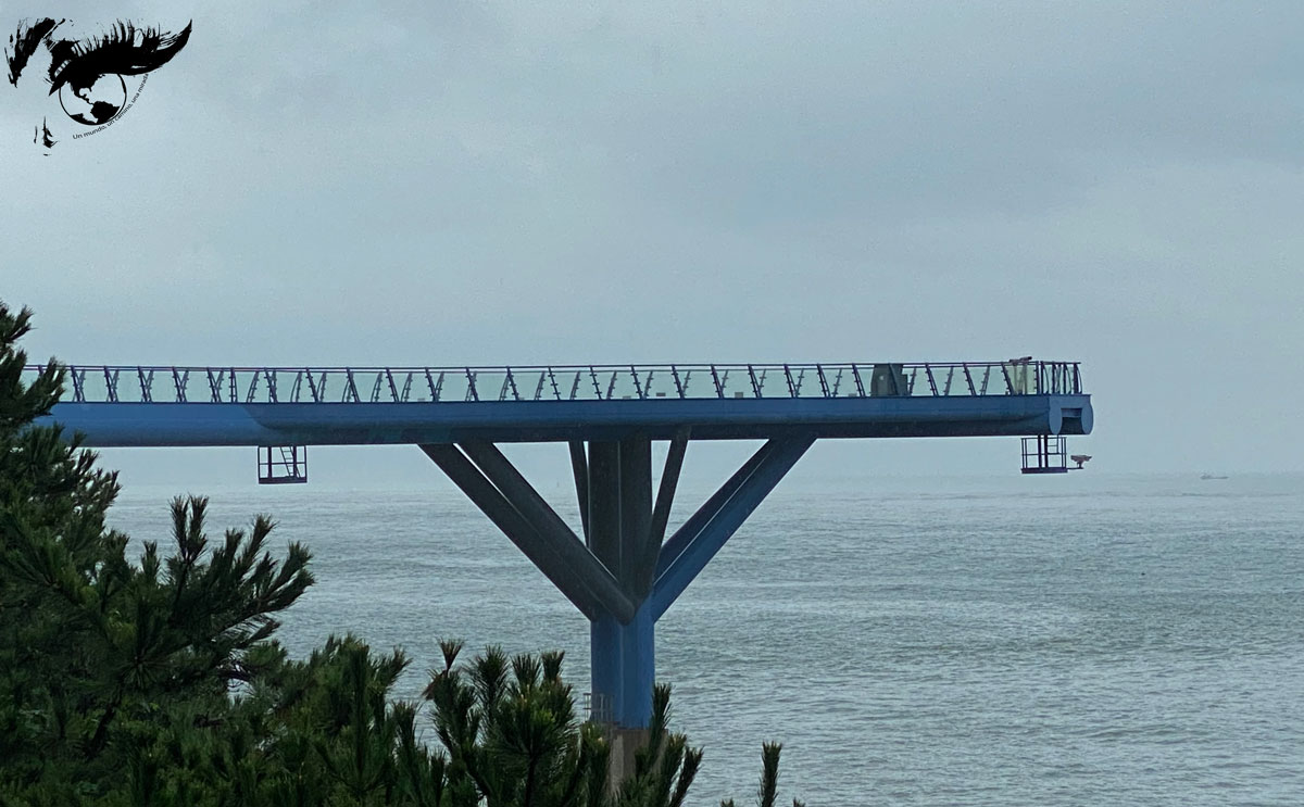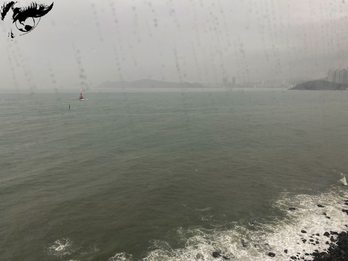 Una vez en Cheongsapo, a pesar de la lluvia, cruzamos las vías y seguimos por el Green Railway (coastal walk) con el objetivo de llegar a Cheongsapo Daritol Skywalk, una plataforma de cristal sobre el océano con una longitud de 72,5 m y una altura de 20 m. Sin embargo, nos encontramos la plataforma cerrada y un cartel que informaba que no se podía acceder debido a la lluvia, por lo que la lluvia nos volvió a fastidiar los planes… Ya que estábamos en medio del trayecto, decidimos seguir caminando un poco más, pero cuando ya estábamos a una parada de la estación de Songjeong la lluvia empezó a apretar aún más y tuvimos que decidir si seguir hasta Songjeong de donde teníamos intención de coger un bus hasta el templo Haedong Yunggunsa o dar la vuelta. Finalmente, dado que aún nos quedaba un trozo de camino y que luego el trayecto hasta el templo nos llevaría una hora más, decidimos volver a Mipo con el Beach Train. Por suerte, en cada parada de tren hay una máquina automática que vende billetes.
