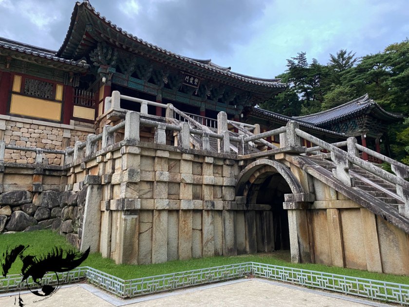 Tras esta introducción, nos hicieron un tour por el templo que duró unas dos horas. Durante este tour, nos explicaron sobre el budismo, sobre la historia del templo, sobre las diferentes partes de un templo budista y mucho más. Unas de las curiosidades de Bulguksa es que está rodeado por un pórtico que solamente estaba permitido para las construcciones de los palacios. Además, las entradas de piedra reciben el nombre de puentes, aunque no lo parezcan, y es que, en sus inicios, se accedía al templo a través de puentes que estaban erguidos sobre un gran estanque que actualmente ya no existe.