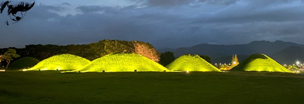 Aunque se nos hizo de noche, no quisimos perder la ocasión de visitar la única tumba real abierta: la tumba Cheonmachong. Teníamos muchísima curiosidad por saber cómo serían estas tumbas-túmulos por dentro, aunque ya os adelanto que no esperéis que se parezcan a una tumba egipcia. Debajo del gran montículo de tierra se esconde un sarcófago de madera junto a un rico ajuar de oro y cerámica. En esta tumba, además, hay un pequeño museo que explica el proceso de realización de las tumbas, así como, el proceso de excavación de esta misma. Las reliquias originales se exhiben en el Museo Nacional de Gyeongju.