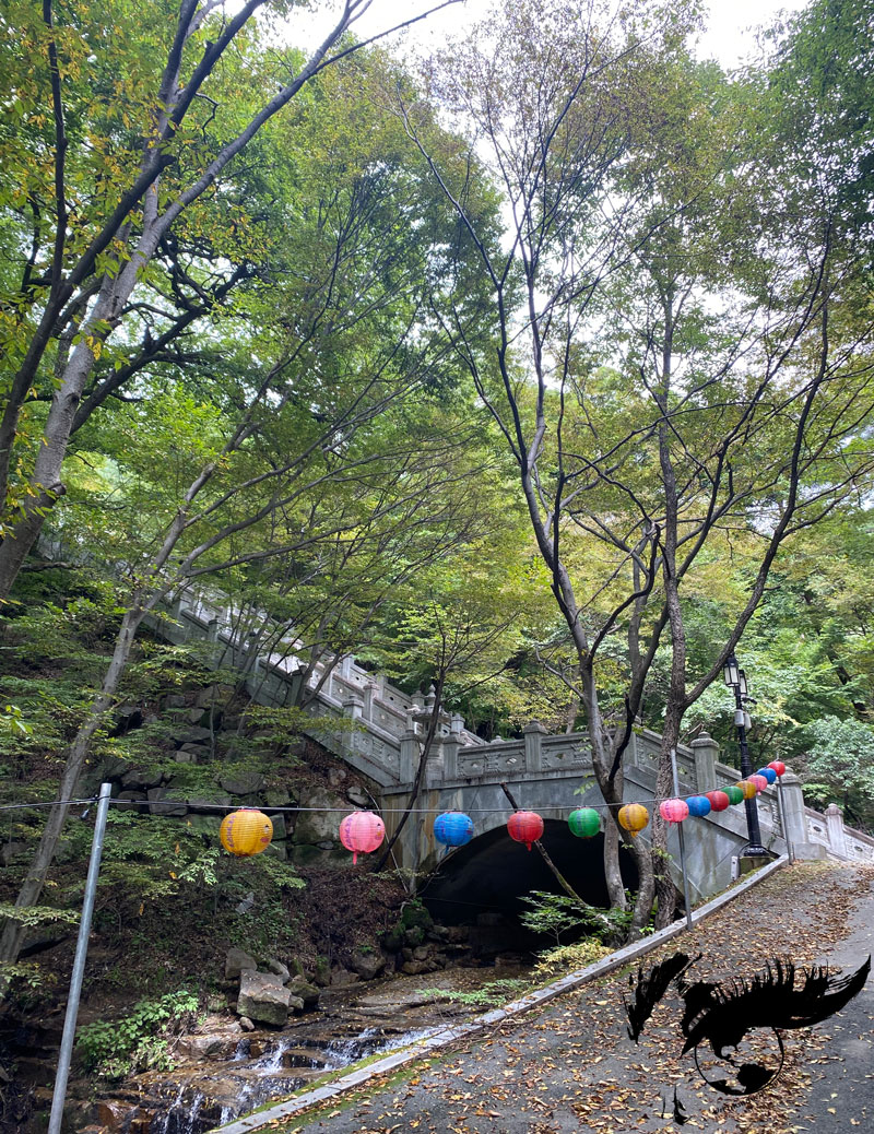 De vuelta a Mipo, decidimos buscar un sitio para comer, porque ya era la hora, y volver a replantear el itinerario (oootraaa veeez…). Directamente descartamos la opción de subir a la torre de Busán porque las nubes estaban muy bajas y seguramente no veríamos mucho, también descartamos el barrio de Gamcheon porque nos pillaba bastante lejos de donde estábamos. Y la opción ganadora fue subir al templo de Beomeosa, ya que, el no haber seguido hacía el templo Haedong Yunggunsa nos dejó con las ganas. Así que tomamos el metro línea 1 hasta la estación de Beomeosa Temple y desde allí el autobús 90. Para nuestra sorpresa, cuando llegamos al templo, la lluvia paró. Y, menos mal, porque para llegar al templo, desde la parada de autobús hay que subir montaña arriba. El entorno del templo es precioso y la verdad impresiona que en tan poco tiempo se pasa de los rascacielos a los bosques.
