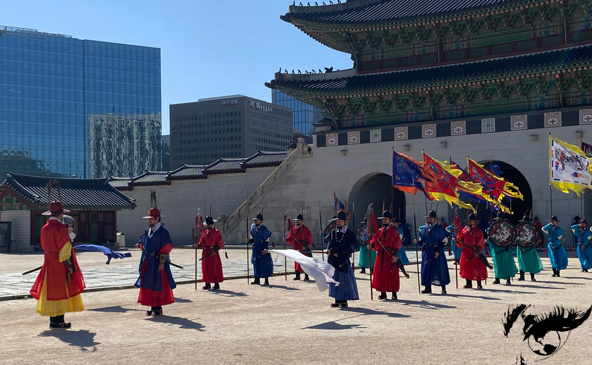 Otra particularidad de este palacio es el cambio de guardia. Se trata de una recreación del cambio de guardia real que se llevaba a cabo durante la época del Rey Taejo y que se puede presenciar a las 10:00 h y a las 14:00 h. Todos los miembros de la guardia van ataviados con trajes tradicionales y tocan instrumentos de la época. En nuestra opinión, de los mejores cambios de guardia que hemos podido ver. Si llegáis media hora antes, como nosotros, además de poder coger un buen sitio, podréis presenciar los ensayos previos.