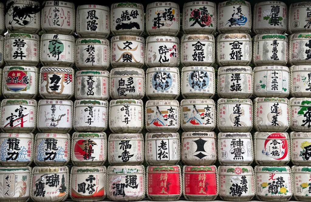 En el camino principal llamado Minami-sando se exhiben barriles de sake llamados kazaridaru, ofrendas simbólicas (no contienen alcohol en su interior) de fabricantes de sake de todo el país, así como barriles de vino francés, donados como símbolo de la conexión cultural entre Francia y Japón. El emperador impulsó la producción de sake como parte de la modernización del país, pero además sentía predilección por el vino francés.